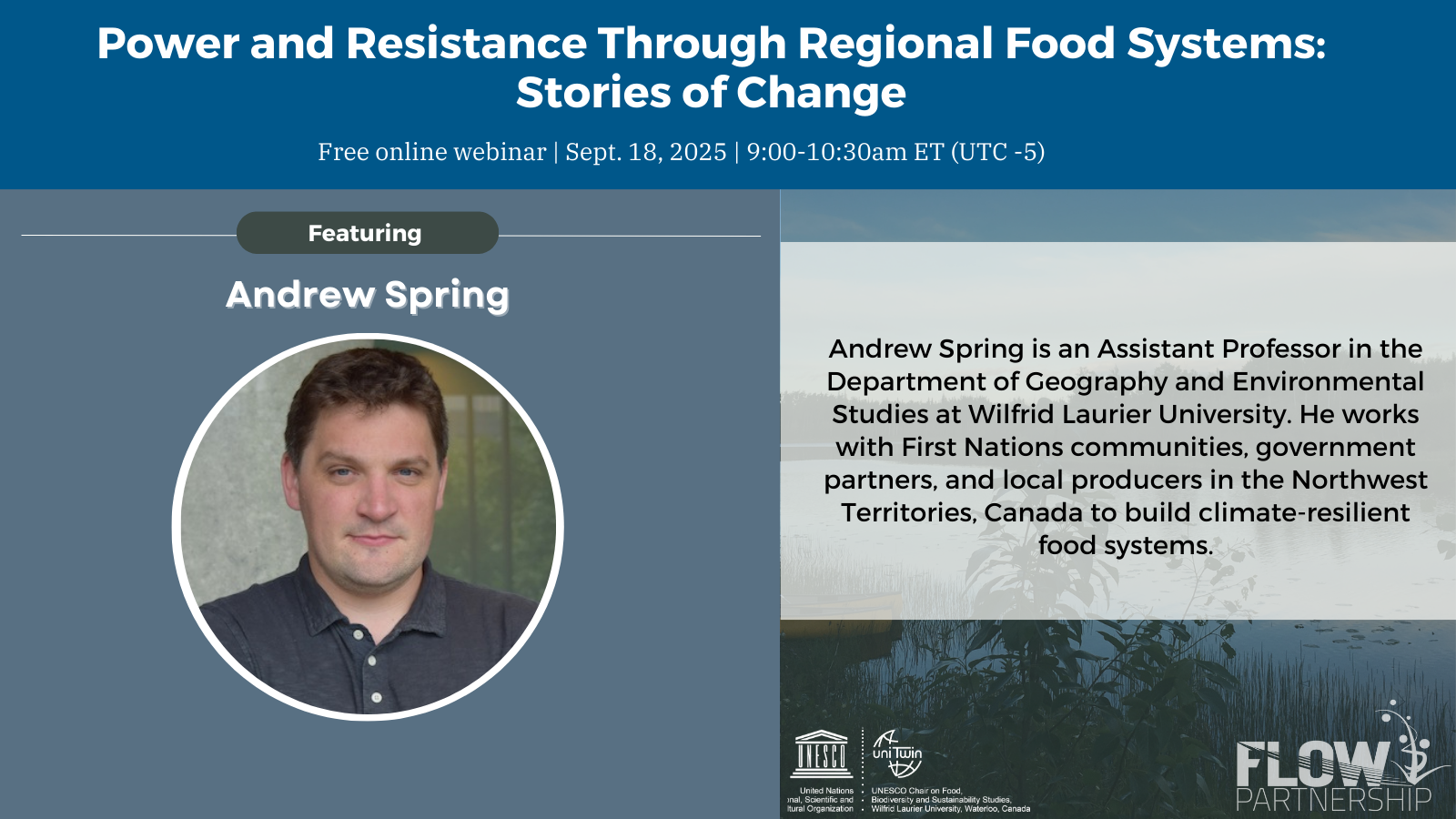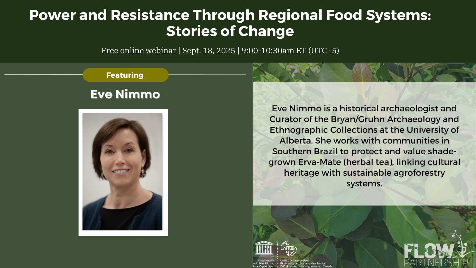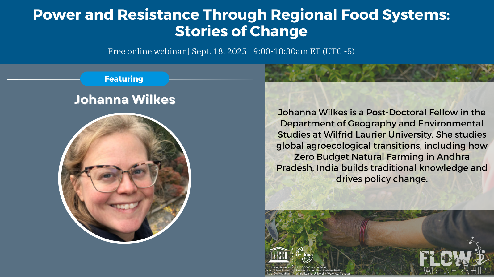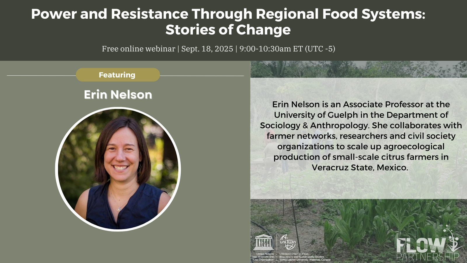 On September 18, 2025, the UNESCO Chair on Food, Biodiversity, and Sustainability Studies hosted a FLOW webinar focused on how the partnership regions manifest the key themes of power and resistance. Power and Resistance in Regional Food Systems: Stories of Change featured Erin Nelson, Andrew Spring, Johanna Wilkes, and Eve Nimmo, offering stories and inspiration from Veracruz State (Mexico), Northwest Territories (Canada), Andhra Pradesh (India), and Southern Brazil.